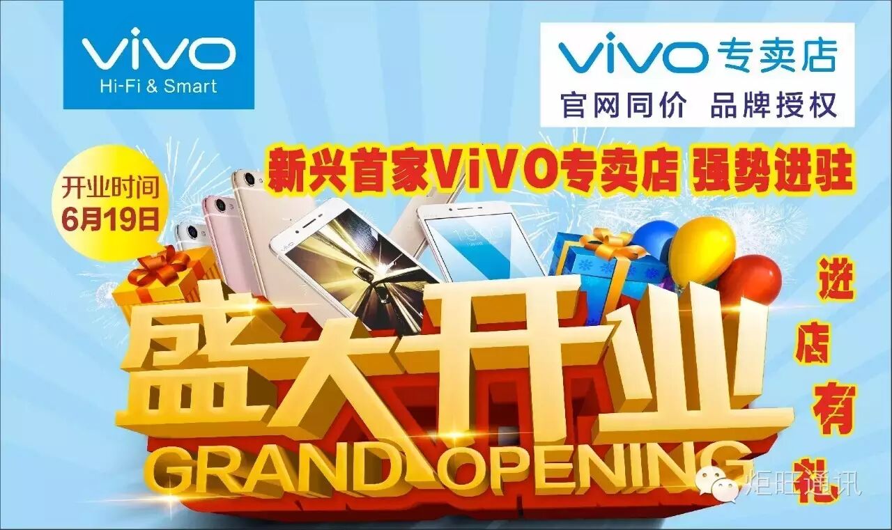 炬旺手机连锁新兴分店(中国联通营业厅) 新兴首家vivo专卖店 联合盛大开业啦~ 如何获得活动资格: 第一步 关注“炬旺通讯”微信公众号 第二步 转发此链接到朋友圈 温馨提示: 完成以上两步 才能获得参与活动的领取资格哦~ 炬旺通讯活动区 ◆ ◆ ◆ 活动1 ◆ ◆ ◆ 活动2 ◆ ◆ ◆ 活动3 vivo活动专区 详细地址:云浮市新兴县新城镇环城东路vivo专卖店(即中国银行大楼左侧) 联系电话:0766-6638333 ↓↓↓ ........................................................................ 买手机到炬旺 货真、价实、服务好,还可分期、支付宝付款 在这里,良好的信誉和优质的服务,让你轻松享受购机的快乐,快人一步领略高科技的魅力,自由体验完美的移动生活。 同等价格比质量,同等质量比服务,秉承着信誉第一,服务至上,顾客为本的经营理念,坚持销售品质最好、价格最优、售后最有保障的手机产品,买手机,就到炬旺通讯,让您高兴而来,满意而归!
