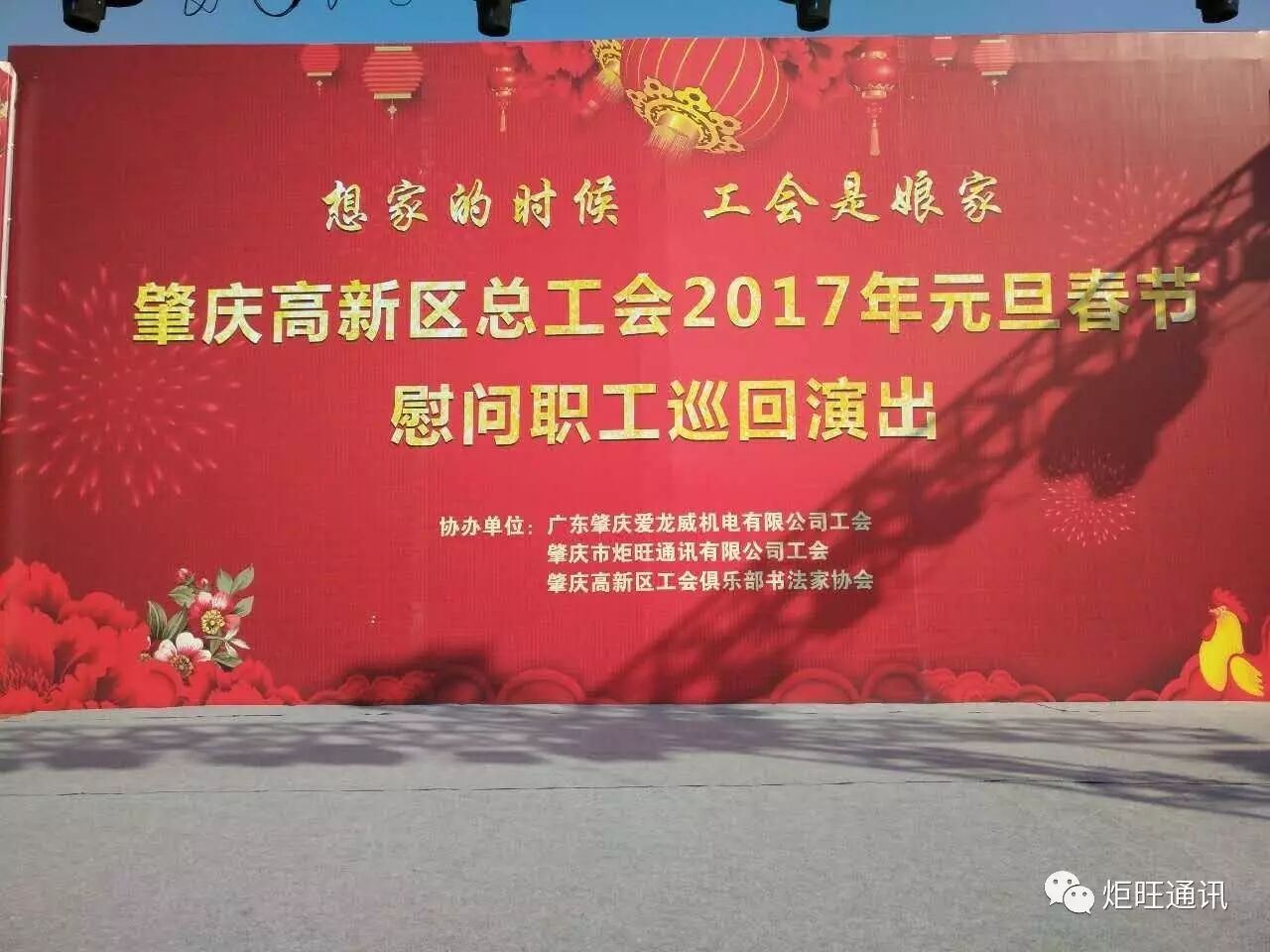 肇庆市炬旺通讯有限公司工会委员会得到肇庆高新区总工会的批准与认可,并于2016年10月成立,感谢区总工会对我司的关心与支持!为丰富全区干部职工群众和广大外来务工人员元旦、春节期间的文娱活动,营造欢乐、祥和、喜庆、浓郁的节日气氛,12月28日晚,在肇庆高新区总工会的组织带领下,广东肇庆爱龙威机电有限公司工会、肇庆市炬旺通讯有限公司工会、肇庆高新区工会俱乐部书法家协会在爱龙威举办了迎新年慰问职工巡回演出。与全区广大职工群众欢欢喜喜的迎接2017年的到来。