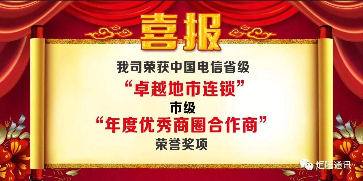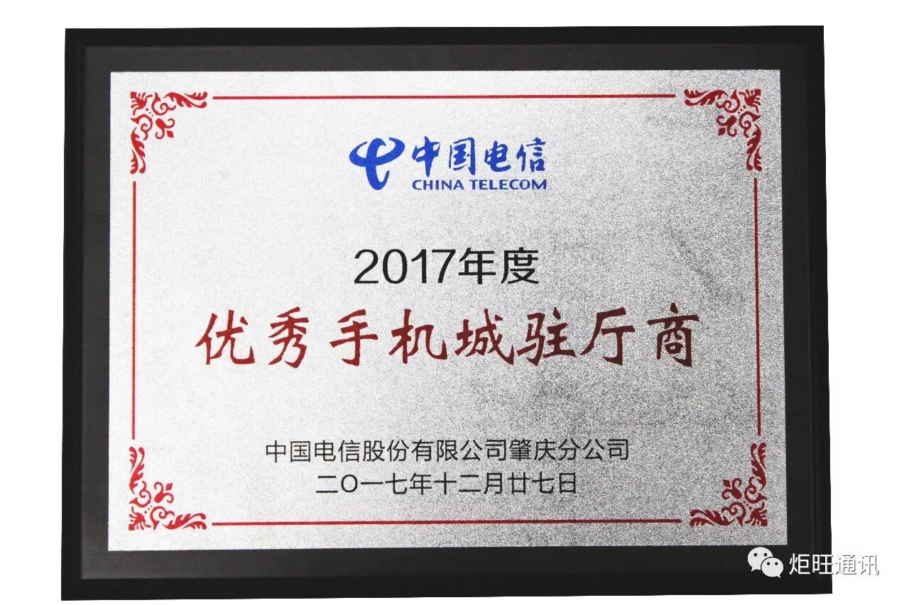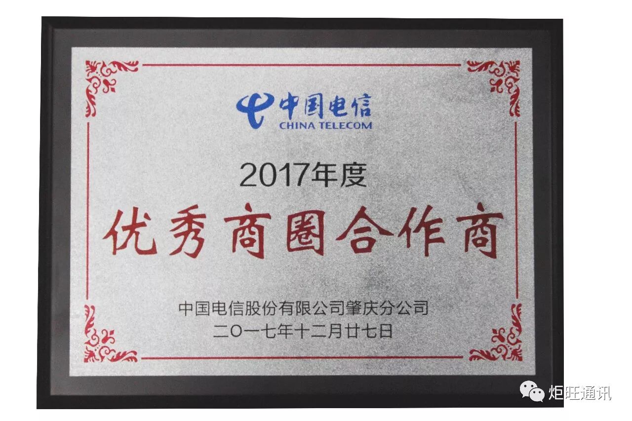 自2011年与肇庆电信开展合作以来,我们获益良多,每一次的进步,都离不开肇庆电信各位领导们的大力支持和帮助,本次盛会,炬旺分别荣获获省级“卓越地市连锁”、 市级“年度优秀商圈合作商”荣誉奖项,中国电信肇庆分公司总经理李宁先生为优秀合作商颁奖。