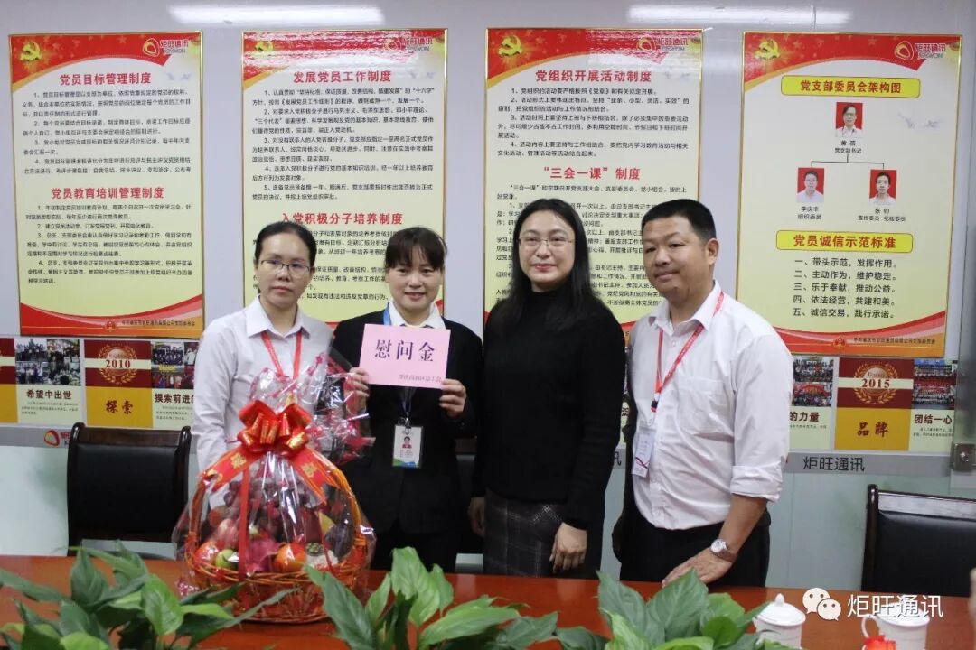 3月6日上午,在“三八”妇女节即将到来之际,高新区总工会副主席、女职委主任李燕萍女士莅临我司,总经理官富财、工会主席罗丹云、副总经理肖泽容全程陪同领导参观指导党建工作及工会建设,亲切慰问我司困难女职工赖桂花,为她送来了慰问金和慰问品,并向她送上了区总工会女职委的问候和祝福。