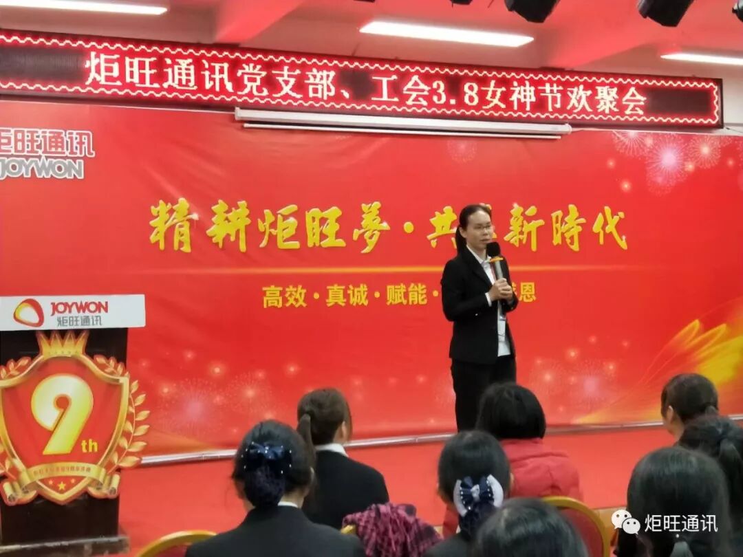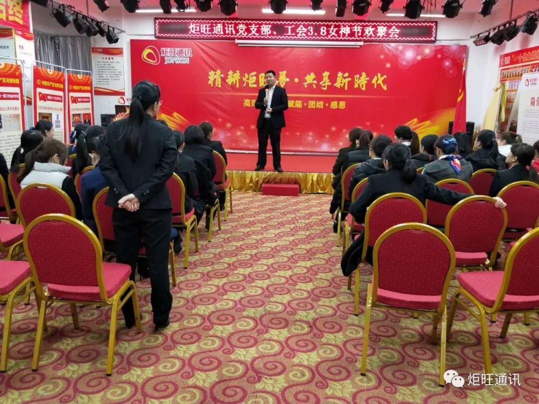 3.8日下午,炬旺通讯党支部、工会共同举办了“3.8女神节欢聚会”,我司总经理官富财先生,副总经理兼工会主席罗丹云女士,党支部书记黄蓓同事等领导也亲临现场,参与了此次活动,对我们女同胞给予节日的慰问和美好的祝愿。“今天女王最大”,总经理官富财先生在三八女神节欢乐现场,亲切问候了各位女同胞,鼓励大家在炬旺的平台上发挥自身价值,巾帼不让须眉,体现了公司领导对女同胞成长鼓励和深厚关怀。总部为大家准备了精彩的节目,让大家在欢声笑语中度过。最后为我们女同胞们送上满满的祝福及节日礼物。
