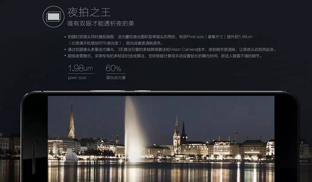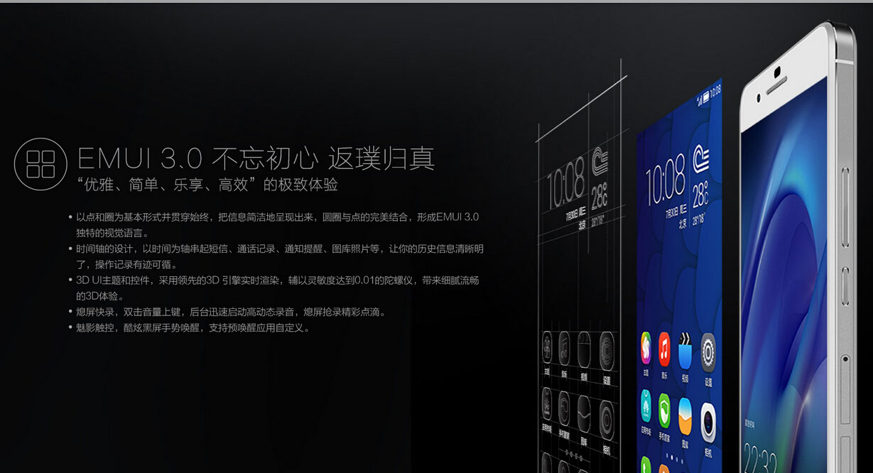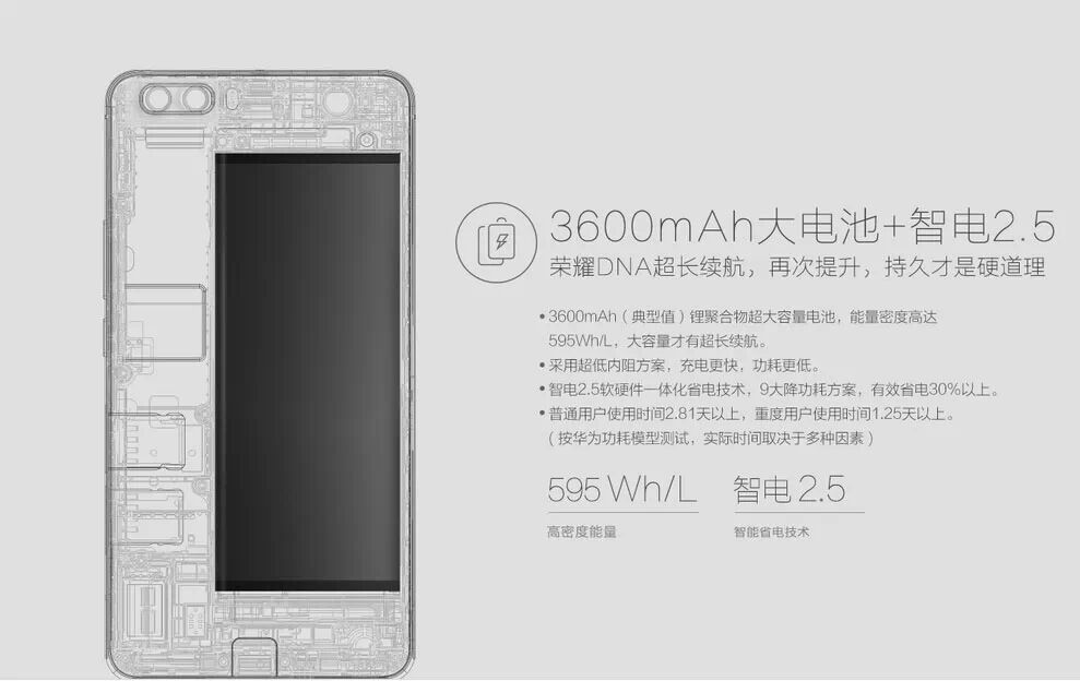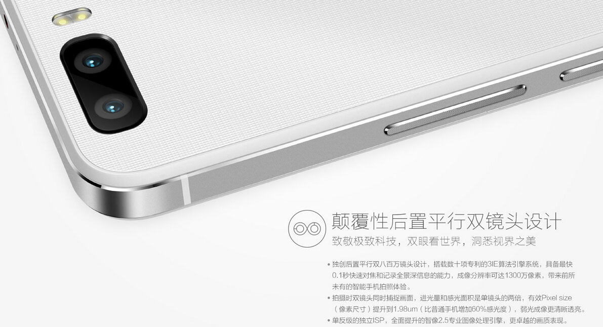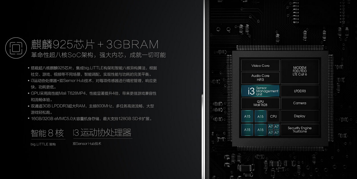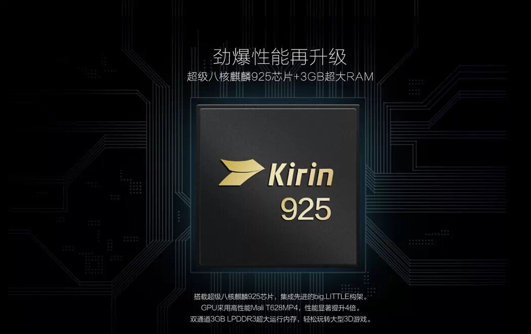 它采用5.5英寸全高清屏幕,搭载自家麒麟925处理器,可以选择支持三家运营商的4G网络。3GB的RAM,搭配16GB/32GB可选ROM。3600毫安时大电池。最大亮点在于背部双摄像头的设计。两个800万像素镜头合成一张1300万像素照片。