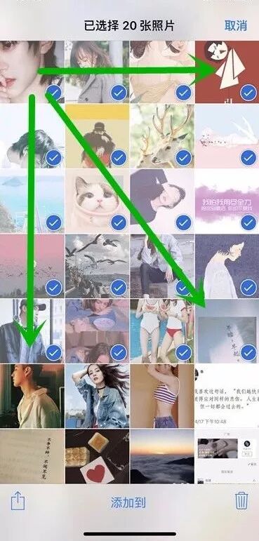 方法很简单,打开【相册】,点击右上角的选择按钮,然后直接右滑、下滑或对角线滑动,就可以批量选择照片,然后直接点击删除就好啦!