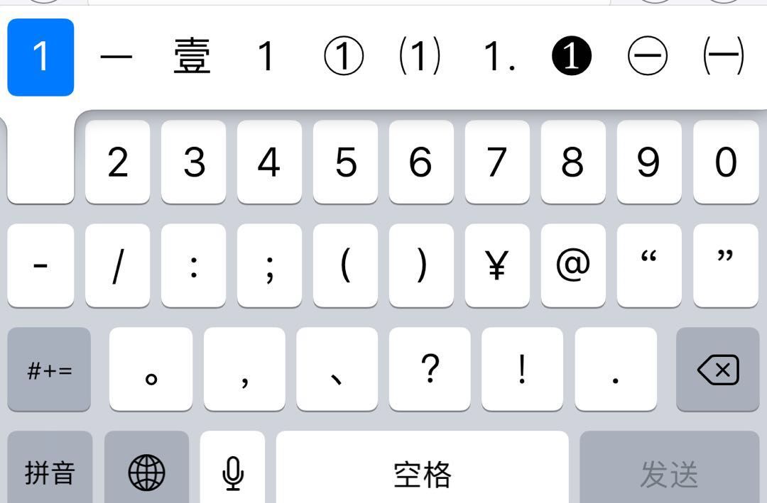 在中文键盘,长按【1】就会【一 ① 壹】等变化。