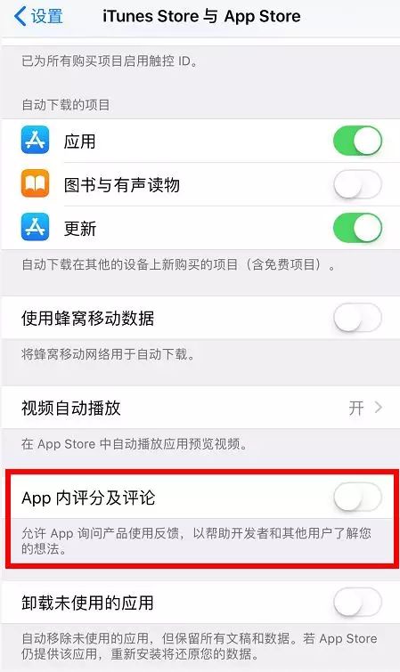 快打开:设置-iTunes store与App store中选择把【app内评分及评论】关闭。