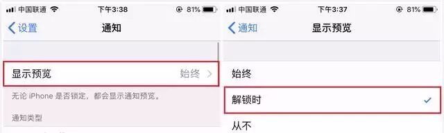 可能大家都知道,iPhone在锁屏状态下如果收到消息或者通知,屏幕就会自动亮起。如果不小心被别人偷看了我们信息的内容,那我们的隐私也将彻底暴露。 进入【设置】-【通知】-【显示预览】-【解锁时或者从不】更改为这两个即可,这样当我们再收到新的通知时就不会显示具体的内容了。
