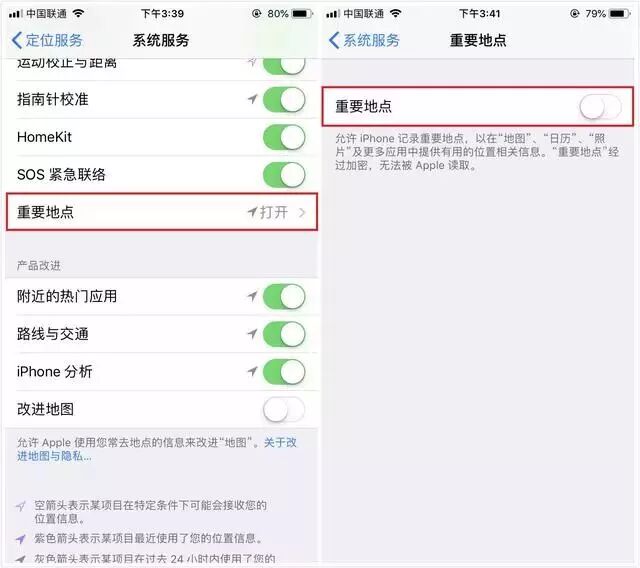 此外,提醒大家把重要地点这个功能也关闭。进入【设置】-【隐私】-【定位服务】-【系统服务】-【重要地点】关闭就可以了。