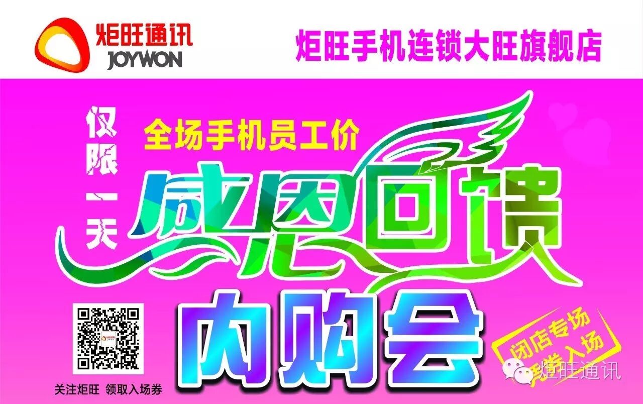 第一步 关注“炬旺通讯”公众号 第二步 回复“内购会入场券”,即可获得电子券一张 第三步 凭电子券到炬旺通讯各大门店换取实体票