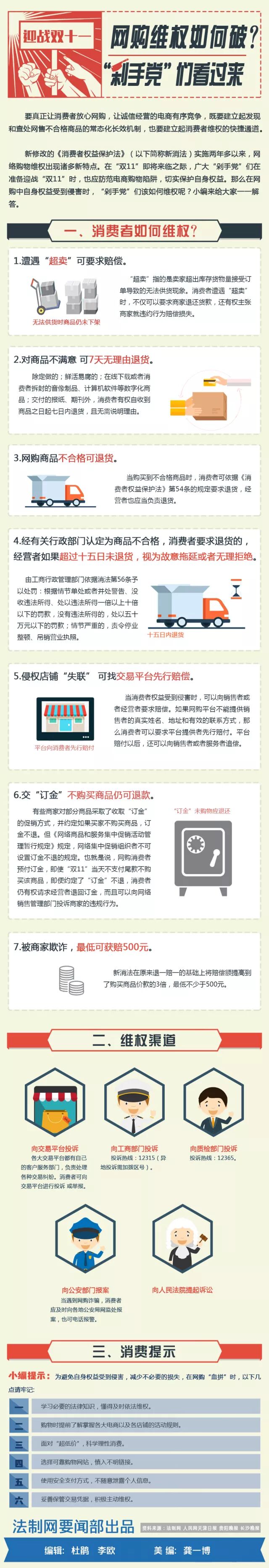 网购这八大常见骗局 ① 退款没准是套路 骗子会借助双十一交易流水大导致网速慢,交易迟钝的现象,借机告诉你单子出现“调单”“卡单”等情况,并故意说没有收到款欺诈客户,要求您提供银行卡及相关信息进行支付,或进行退款给你。 破解之法:遇到这类情况,大家一定要提高警惕,不要相信骗子以任何卡单,未支付成功为借口想你索要银行卡号及验证码进行退款的假话,他们将以此来骗取您的个人财产。 ② 付款链接要谨慎 很多用户在网上买二手东西的时候,经常会直接收到商家发的一些链接地址。如果点击了,我们无意中打开的链接地址有可能就成为我们中木马病毒的根源,然后骗子会借助这个机会盗取客户的银行卡密码,从而盗刷你的钱。 破解之法:一定要使用正规的付款途径进行付款,不要点开不明来路的付款链接。 ③ 中奖、红包诈骗已瞄准你 双十一购物狂欢节马上来临,各种好玩、刺激的红包纷纷来临,但在大家抢红包的同时,各路骗子也伺机而动,放出了一大波病毒红包、假红包和假中奖信息来坑骗大家。 “双十一”期间,很多人会陆陆续续的收到一些商家的中奖信息、微信红包、qq红包等,甚至有些逼真到连你都相信的地步。这个时候留心一下。 破解之法:看一看你所购买的产品中有没有这家的产品,然后最好是能在官方平台网店里直接和卖家联系确认消息,切记不要随意拨打中奖信息提供的电话号码和发来的网站链接地址。同时,假的微信红包通常要让大家进行多次转发后才可以提取,并且打开后会出现链接,遇到这种情况,请大家果断停止自己的动作,这都是骗子的行为。 ④ 恶评诈骗 对于淘宝店店主,恶评诈骗的骗局一定要小心。 骗子会冒充客户在你的网店里购买产品,然后在收到货之后以质量差、不是自己想要的等等借口要求你给个说法。他们不愿意退货也不愿意换货,如果你要是不给个说法就给你差评。而一个差评对店家来说需要多少个好评才能换来,所以很多店主会出一点血来安抚这些客户的心。 破解之法:其实遇到这样的客户,店主应该主动提出退款,在确定产品寄回来之后将钱退还。 ⑤ 警惕商家以次充好 现今网络购物,有一种商家叫做炒货商家。他们的商品从价格和图片上看起来都十足高大上,但实际上却是一些残次品。 破解之法:购买之前大家可以仔细翻阅商品交易评价,并就质量问题与卖家进行沟通,保留旺旺等聊天记录。如果不小心购买到这类商品,一定要果断及时退货,不要犹豫。 ⑥ 虚假海淘要当心 海淘如今很流行,但无论是面对海淘,还是代购,抑或是更有档次的跨境电商,大家都要睁大眼睛,连跨境物流信息、购物小票都可以假冒,更别被网页上标明的日本、美国、澳大利亚来源字样的文字给骗了。 破解之法:建议到正规网站进行购买,不要随意相信一些流传分享的购物链接。 ⑦ “到付”“免费送”藏骗局 有些骗子专门以做活动的名义,告诉你商品是免费的,但需要付我二十几元的邮费。虽然图片上的商品肯定都是高大上的,但当你收货后就会发现商品往往不值几块钱。 破解之法:不要相信天上掉馅饼的事情会发生,遇到这种情况一定拒绝参与此类活动。 ⑧ 朋友代付别轻信 在“双十一”这样的日子,平台方又是抢购,又是秒杀,氛围很是热闹。骗们子会通过某些即时聊天工具,伪装成你的亲朋好友希望你能帮忙代付。如果你中招,很快就会发现代付后被拉黑。 破解之法:如果遇到此类信息,一定要先与亲朋好友进行联系,核实确认确有此事后用正规的付款方式帮忙付款,万不可轻信此类信息,中招被骗。 “剁手党”如何维权