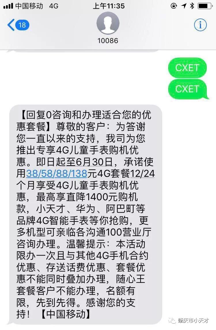 福利 轻松带回家 办理资格:发送短信CXET到10086查询参与资格 符合条件即可免费领取 小天才电话手表 符合条件的客户,转发本条链接到朋友圈+9.9元即可免费领取价值69元小天才书包和55元话费流量卡 数量有限 先到先得 送完即止 不符合优惠的客户 需积68个赞+9.9元也可以领取小天才书包喔! 并加送一张55元的流量卡喔! 数量有限 先到先得 送完即止 名额有限,送完即止! 符合条件的幸运客户 赶快到炬旺政德营业厅 中咨询办理吧! 数量有限先到先得哦 小天才电话手表