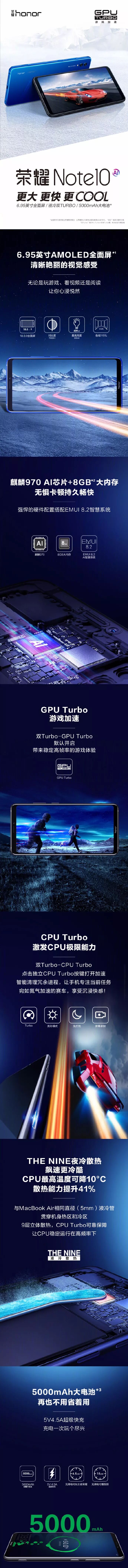6.95英寸AMOLED全面屏 5000mAh大电池+5V / 4.5A超级快充 麒麟970+EMUI8.2 8GB大内存 THE NINE液冷散热技术 双Turbo 对称式双扬声器+杜比全景声 后置2400万+1600万AI高清双摄 AIS手持超级夜景 荣耀Note10 8月3日 炬旺通讯全面现货首销