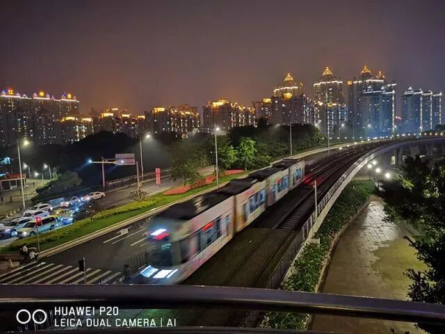 这张照片,华为P20将大桥上的灯光控制得相当到位,就连暗光部分的桥墩都展现的一清二楚,噪点控制也非常好。 这是因为,华为P20拥有1.55um大像素尺寸1200万彩色镜头(F/1.8),另外一个是2000万像素黑白镜头(F/1.6),不管是对细节的把控,还是对光线的敏感度都表现得非常出色。 都说没有对比就没有伤害,同样的场景,用另一部手机与华为P20同拍一张照片时,差距就能真正体现出来了。 ▲一般手机 ▲华为 P20 小编可以很自豪的告诉你,无论是从亮度、细节,还是解析力、噪点等控制方面,华为P20都比另一部手机要略胜一筹。 这张是抓拍的一辆正在奔驰的轻轨列车。我们可以看到,移动中的列车在照片成像上并没有糊成一片,说明华为P20快门速度很快,同时还保证了画面亮度。 这都得益于华为P20的OIS+EIS电子防抖,配合AI防抖,在软硬结合下只需按下快门就能抓拍到夜晚中的移动物体。 遇到极暗的夜景情况,华为P20 Pro提供最长6秒的手持【超级夜景】模式,通过AI防抖的辅助,即使用手拿着拍夜景也不怕图像虚化,色彩还原度也很高,可以说是相当地给力。 另外,徕卡的色彩很讨好眼球,在上方还有三种模式提供给你任意切换:标准,鲜艳,柔和。 最后再来了解一下室内暗光下的表现,华为P20的成像效果同样出色~ 都说夜拍才能真正显示出一部手机摄影能力的强弱,那今天看完华为P20系列的具体表现,相信你对它的拍照实力也有了一定的了解。 HUAWEI P20系列手机 拍摄无惧天黑! 炬旺各大门店现货发售 欢迎您的到来