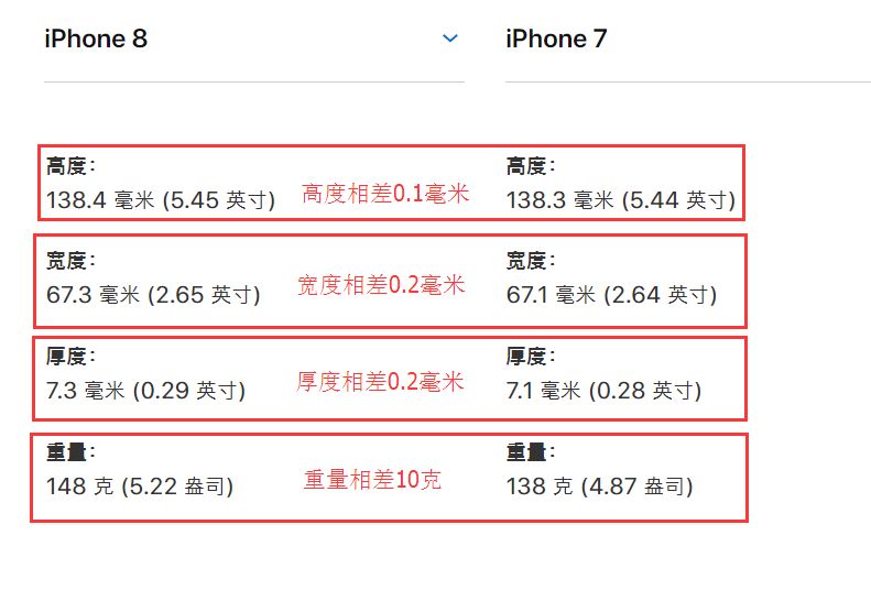 iPhone7和iPhone8虽然外形和比例看起来一样,但其实还是存在细微的差别的。从官网给出的数据来看,iPhone8比iPhone 7高0.1毫米,宽度和厚度也差了0.2毫米。