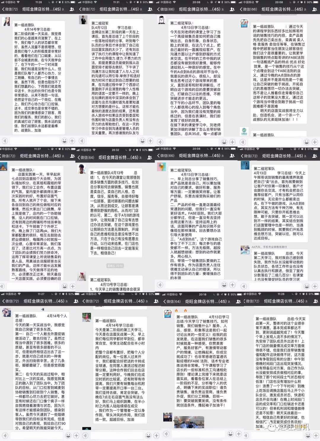 店长是门店的灵魂,是领头羊,店长的工作能力及领导能力,直接影响整个门店的业绩。 从您成为店长的一刻起,您不再是一名普通的员工,您必须站在经营者的角度,努力达成经营目标。 一个优秀的店长,到底应该怎么做? 您是否有以下的困惑? 1.促销效果不明显,公司目标不能达成,销售压力大,没有外促的方法,甚至缺乏店外销售的勇气 2.不知如何与领导、下属、同级沟通 3.店长是销售能手,但不会管理,不会科学的分析店铺数据 4.不能激发员工的激情,团队沟通不畅(店员不听从店长安排或是店员勾心斗角) 5.店长责任感不强,解决问题的能力差,总是被店员牵着走 6.顾客异议处理不当,造成顾客流失,甚至有冲突发生 7.店铺的气氛不好,店面形象不规范,陈列不科学、不生动、无重点 8.不知道如何进行市场调研 9.不会上传下达,店长传达公司指令结果五花八门,会议白开 10. 新员工难招,招来了难留,对员工太好,员工不容易听话,对员工太严格,感觉受不了,不知道应该如何对待新员工 11. 执行力差,新制度执行了一些日子,就不知不觉不执行了 ……………………………… 没有经过培训上岗的店长,不是因为他不努力,而是因为他不知道怎么做,上岗后出现问题还不培训店长,就是公司的最大损失,因为店长能力直接决定门店的业绩… 店长,您要怎么办?调价格?改陈列?调整商品结构?训练员工?…如何才能快速提升门店的销售业绩?如何才能在处于竞争劣势的情况下蜕变?如何才能在危机中求生存,赢取更多的利润?如何才能留住核心员工的心..... “学习力就是竞争力”, 这不是口号,而是事实, 您可以不学习,但您的竞争对手绝对不会停止学习! 一场店长必须经历的课程 一场高标准精品质的课程 一场让你受益终身的课程 ▼▼▼▼▼ 炬旺国商学院 《金牌店长特训营第3期》 两个阶段,8天课程,30天持续跟进 得到几年都不曾有的收获 揣着知识,怀着收获,带着感恩 不忘初心,砥砺前行,誓成精英 学院介绍 1、目标达成无执行力。如何做好目标分解与追踪,防止员工破罐子破摔?如何线上线下并举引流,“抢”客进店? 2、沟通协作无执行力。如何有效沟通?快速说服员工达成共识? 4、领导执行无执行力。威信不足,新老员工不听话,如何提升执行力? 6、如何激发员工斗志?如何做到天天激情销售? 【课程时间】: 一阶段:7月12日-15日 二阶段: 8月16日-19日 两个阶段需持续学习,长达30天的学习进程跟踪,理论实践相结合,全程解决学习后的迷茫! 【主办方】:炬旺国商学院 【课程对象】:运营管理、区域经理、培训经理、督导、店长、领班、储备店长、资深导购等;为获得最佳的落地效果,产生最佳绩效,特别建议黄金团队组合:运营管理者+培训经理+督导+精英店长!人多特价优惠! 刘院长18820365588 向老师18820361988 十大课程要点 一、店长的身份和心态 二、店长应有的能力 三、店长的一天 四、销售团队技巧打造 五、拓客系统应用 六、营销思维及营销拓展 七、运营商业绩突破 八、会议与沟通 九、产品库存管理和数据分析 十、危机公关处理 这是一场蜕变,一场精神的洗礼 《金牌店长特训营》铁血开营 通讯行业的精英们,您准备好了吗? 往期部分学员总结 往期精彩